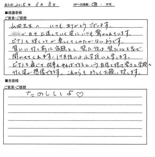 練習の仕方を教えると、すぐに弾けるから 器用だし、すなおだから、上達すると思います。